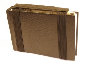 Slip the hood over the sketchbook, then slide on the cuffs, leaving enough slack in the ‘chain’ to create a handle. The handcuffs can be used alone (as shown), and will hold pens/pencils securely under the ‘chain’.
